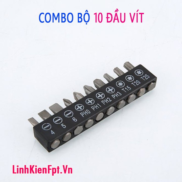 Bộ sản phẩm gồm: 10 đầu vít với các dạng đầu dẹt, đầu 4 cạnh , đầu 6 cạnh