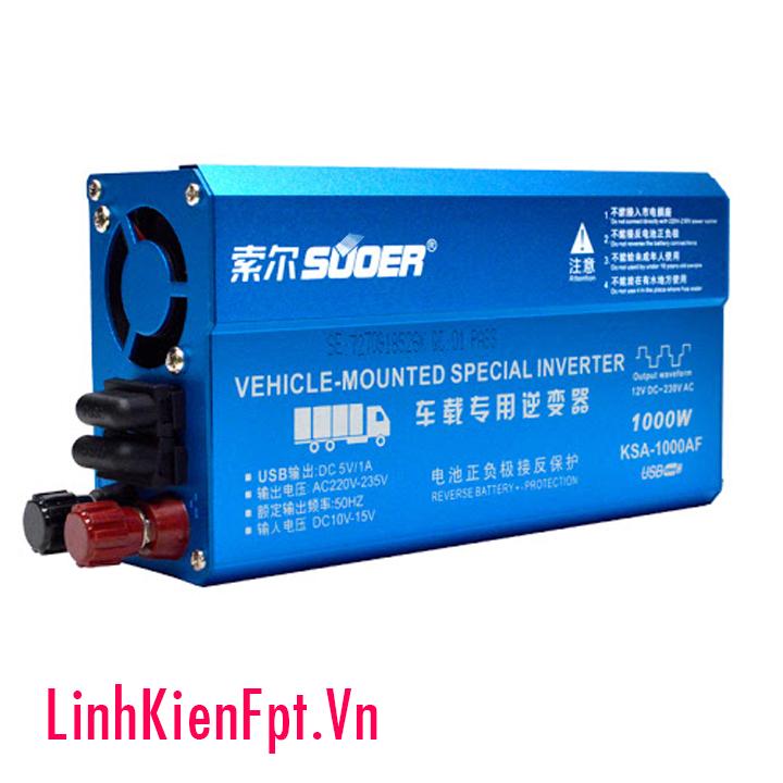 Bộ đổi điện Inverter 12V~220VAC 1000W KSA-1000AF là Thiết bị chuyển đổi nguồn điện DC từ bình ắc quy 12V lên điện AC 220V để dùng thiết bị điện dân dụng.
