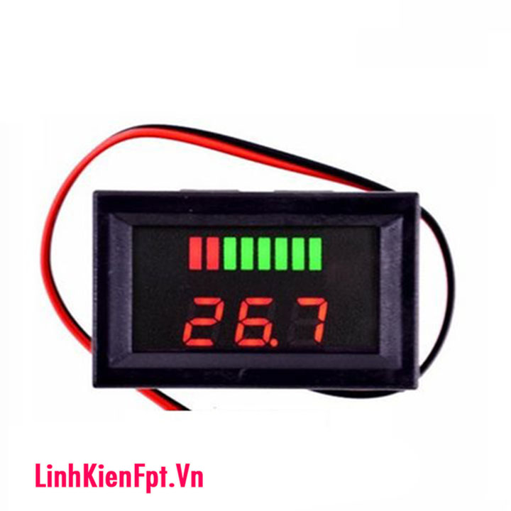 - Đồng hồ có màn hình hiển thị kép giữa điện áp và dung lượng được thể hiện trên màn hình. Màu hiển thị dung lượng gồm 8 thanh gồm 2 thanh màu đỏ 6 thanh màu xanh.