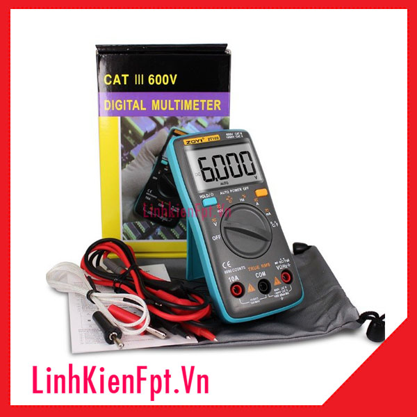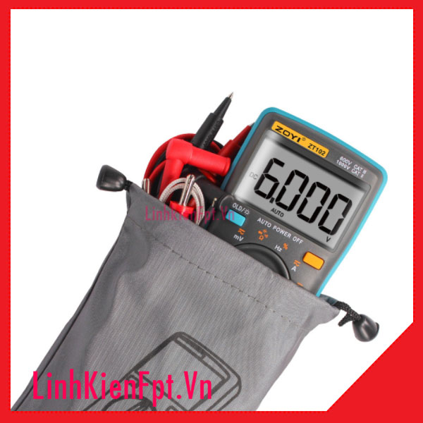 Đồng hồ vạn năng ZT 102 đi kèm túi đựng tiện dụng. Thân máy làm từ nhựa cao cấp cho độ bền cao, cách điện hiệu quả. Núm vặn dạng xoay dễ sử dụng. Khi đo kết quả sẽ được hiển thị lên màn hình LCD dễ nhìn.