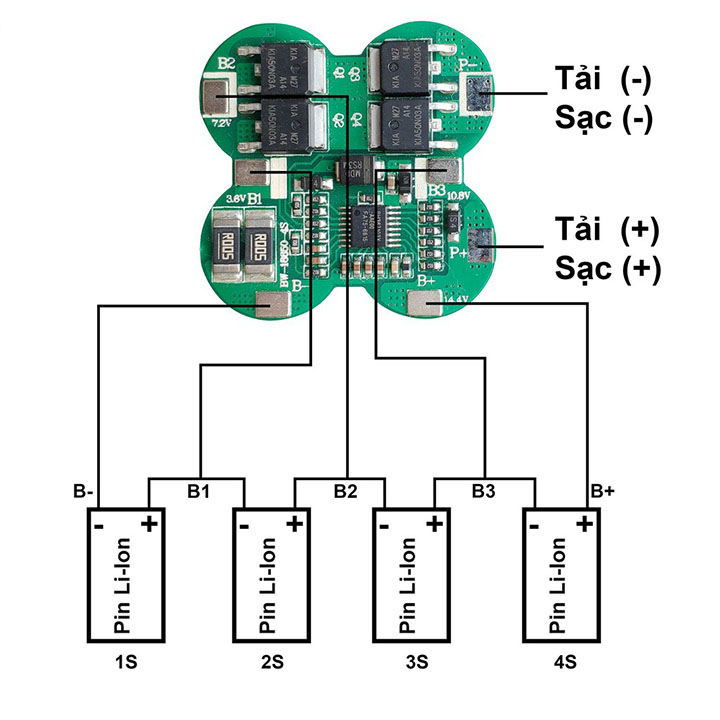 - Hàn theo thứ tự từ B- (0V), B1(3.6V/4.2V), B2(7.2V/8.4V), B3(10.8V/12.6V) và B+ (14.4/16.8V).