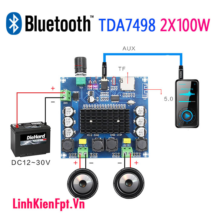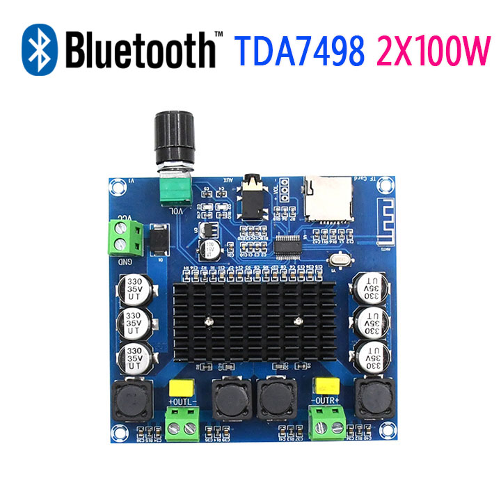 + Mạch khuếch đại bluetooth TDA7498 sử dụng chip khuếch đại Class D TDA7498 cho ngõ ra 2 kênh với công suất mỗi kênh 100W.