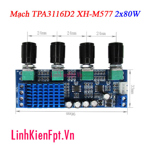 Mạch sử dụng chip khuếch đại class D TPA3116D2 cho ngõ ra 2 kênh với công suất mỗi kênh 80W. Ngoài ra mạch được thiết kế với 4 chiết áp điều chỉnh âm lượng và âm sắc Bass - Mid - Treble giúp bạn dễ dàng điều chỉnh âm thanh theo ý thích.
