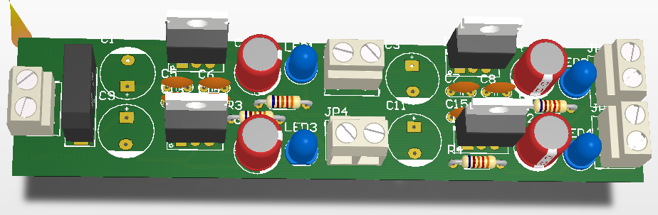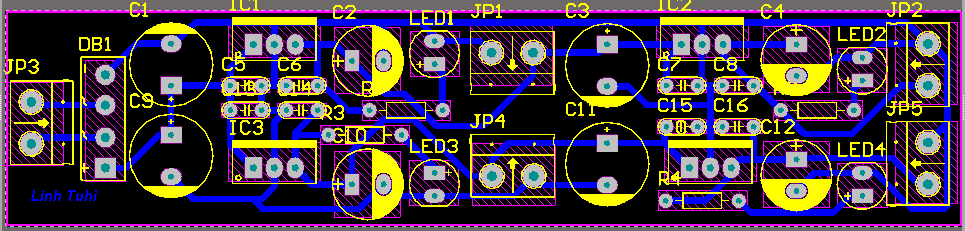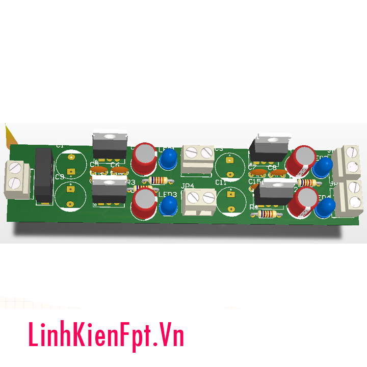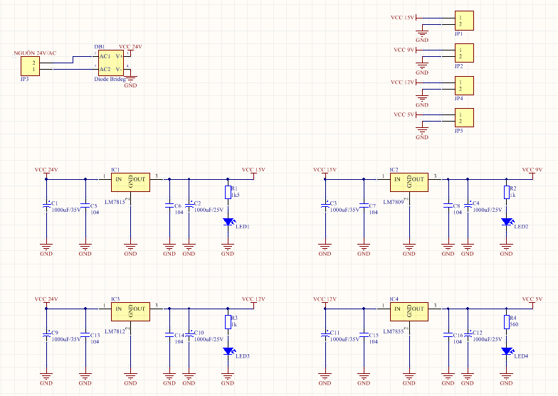- Tụ C3 và C4 để lọc điện áp cấp cho tải tiêu thụ lấy từ chân Vo của IC 7805, tụ C3 có các dụng cung cấp điện áp tạm thời cho tải khi điện áp tải đột ngột bị sụt áp, tụ C4 trở kháng lớn, C4 có tác dụng lọc nhiễu điện áp đầu ra (nhiễu là các điện áp không mong muốn làm cho dạng sóng điện áp ngõ ra có hình răng cưa).