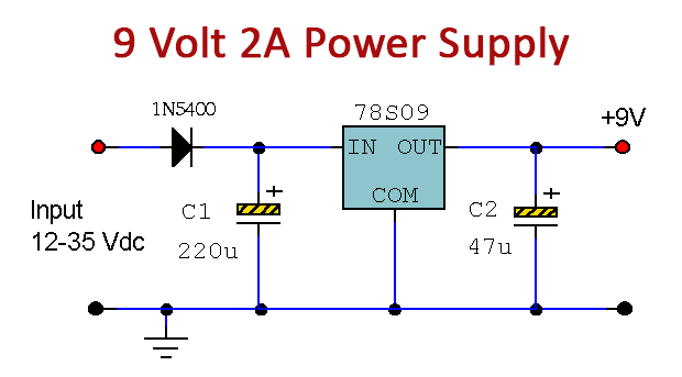 Hoạt động của mạch này khá đơn giản. Trái tim của mạch này là một IC L78S09. Một đầu vào 12-35V DC được lấy từ một nguồn cung cấp đi vào IC điều chỉnh điện áp L78S09, Mạch sẽ hoạt động mà không cần các thành phần phụ, nhưng để bảo vệ phân cực ngược, một diode 1N5400 có mặt ở đầu vào, nhiễu còn lại được loại bỏ bởi Tụ C1 ( 200uF).