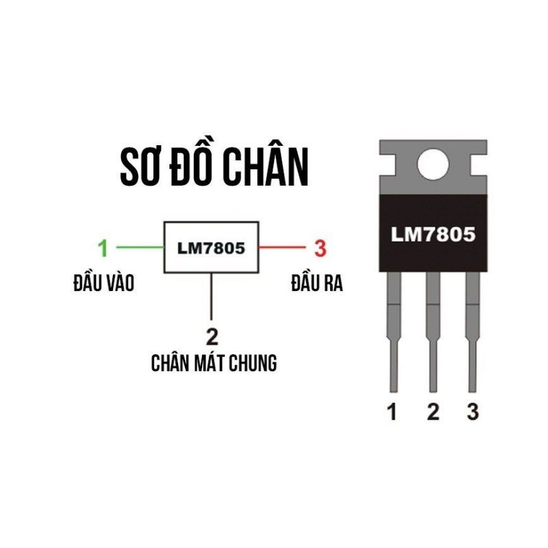 Chân thứ nhất là để cấp điện áp DC đầu vào, chân thứ 2 là chân để đấu với mass (chân GND), chân thứ 3 là chân ngõ ra điện áp ổn áp, trong trường hợp này chúng ta đang nói về IC 7805 nên điện áp ngõ ra là 5V (với điều kiện là điện áp đầu vào lớn hơn 5V). Điện áp hoạt động của IC khuyến cáo nên ở khoảng 1A để IC hoạt động được lâu dài.