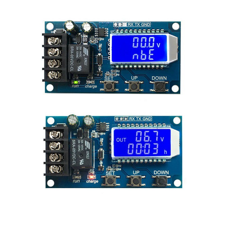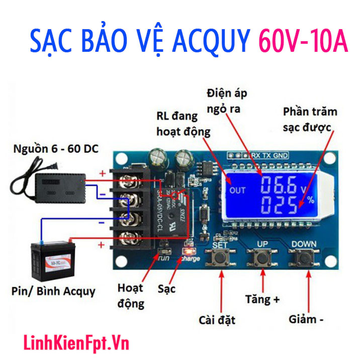 – UP : Tăng giá trị / Xem phần trăm sạc(00.0%). Nhấn “UP” giữ 3s, mạch hiển thị L – P OFF : đèn nền luôn sáng, L – P ON : đèn nền sáng trong 5 – 10 phút.