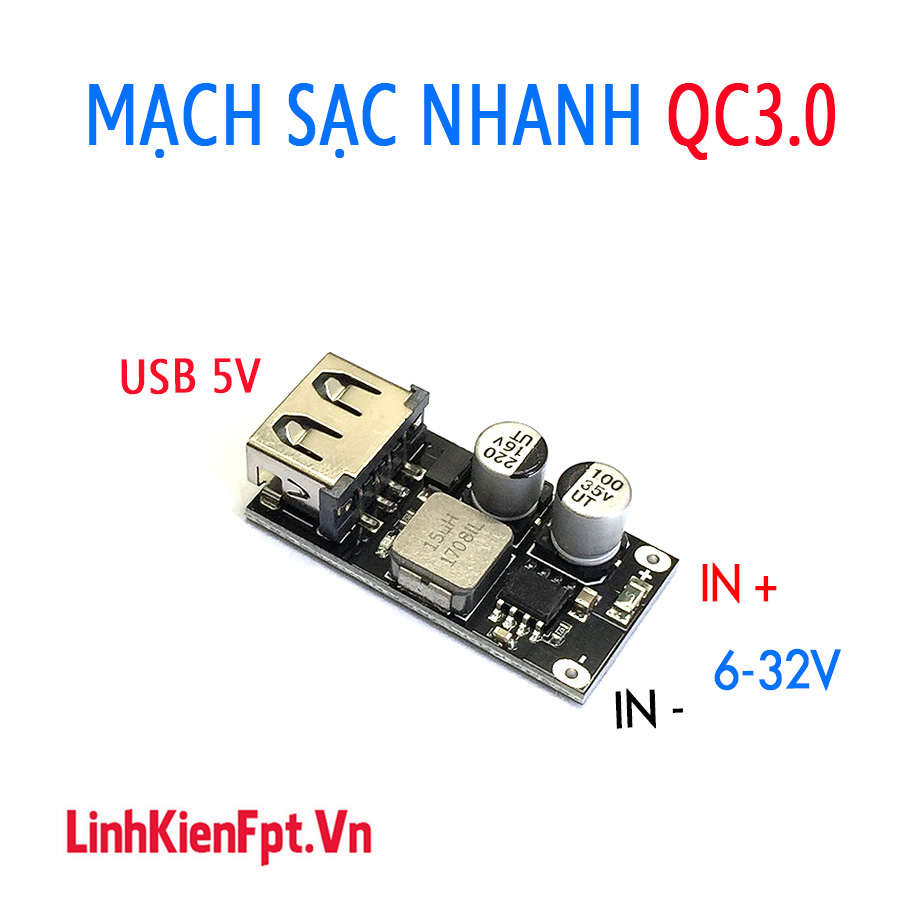 - Mạch Sạc Nhanh QC3.0 Là mạch hạ áp từ 6-32v xuống điện áp 5V. thông qua cổng USB