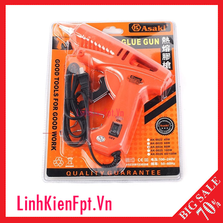 Súng bắn keo Asaki 2 Chế Độ 60W-100W AK-9026 sử dụng thanh keo loại ɸ11mm, súng có tốc độ nóng nhanh, keo ra đều, phù hợp gắn những vật có kích thước tương đối lớn không cần lượng keo nhiều. Súng có chất lượng tốt, hoạt động bền bỉ, súng có công tắc ở tay cầm để tạm ngừng gia nhiệt, có đèn báo thiết bị đang hoạt động.