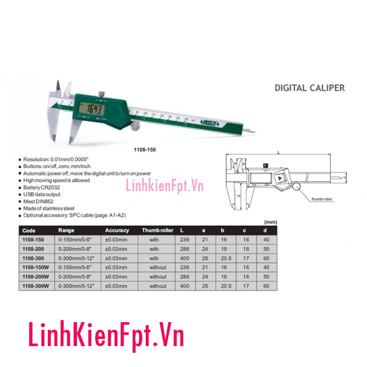 Thước cặp điện tử Insize có model là 1108 và thanh đo tối đa là 150mm. Đây là loại thước đo cao cấp hiển thị kết quả trên màn hình LCD có gắn thước.